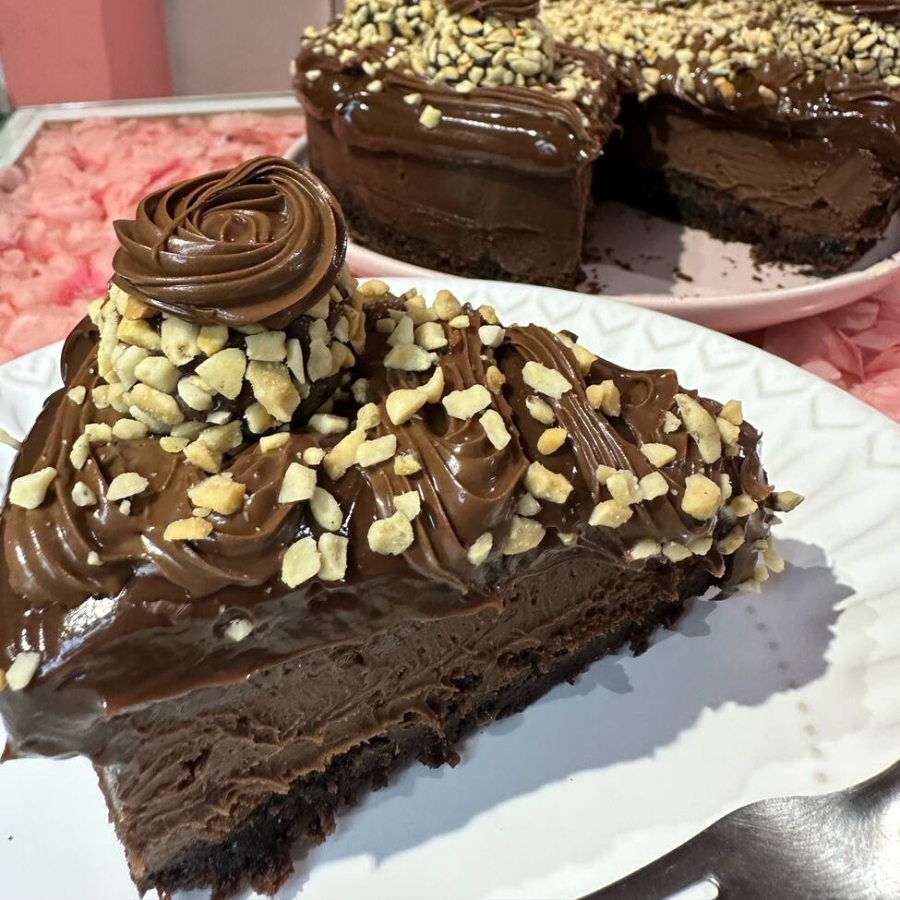 Torta inspiração bombom ferreiro, base de brownie chocolatudo, mousse de chocolate , brigadeiro 50% cacau, Nutella e amendoim, uma explosão de sabor. (Peso aproximado 220 gramas)