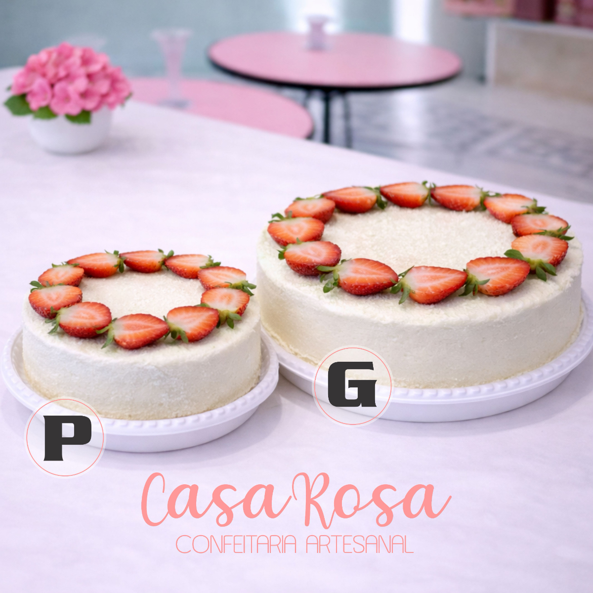 Massa fofinha feita com leite Ninho , coberta com creme de Ninho e leite Ninho em pó e morangos frescos. (cobertura tbm no furo do bolo...muita cobertura) (Serve aproximadamente 5 pessoas) (Peso aproximado 900g)