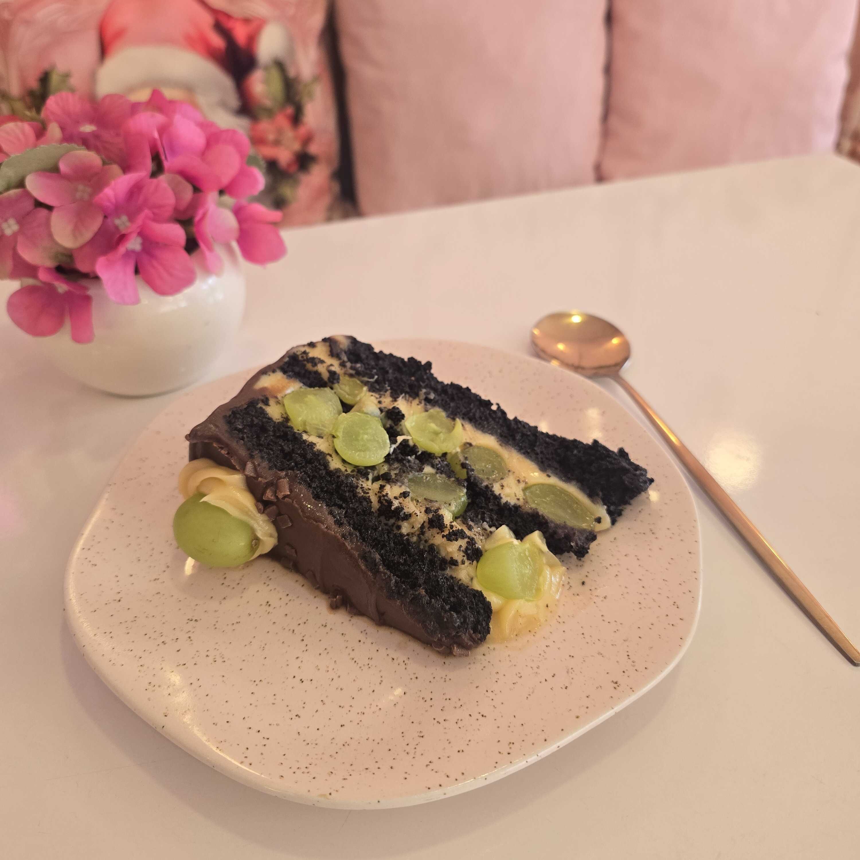 Massa de chocolate fofinha e molhadinha, recheada com brigadeiro branco e uvas frescas. (Peso aproximado 200g)