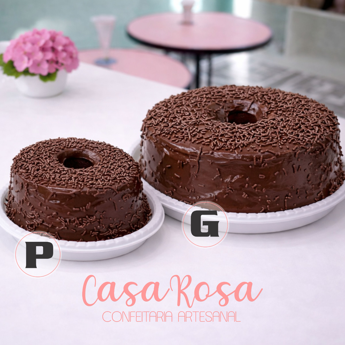 Massa fofinha e úmida de chocolate 50%, coberta e recheada no furo com brigadeiro cremoso e chocolate granula.. Muita cobertura. (Serve aproximadamente 10 pessoas) (Peso aproximado 1.5kg).