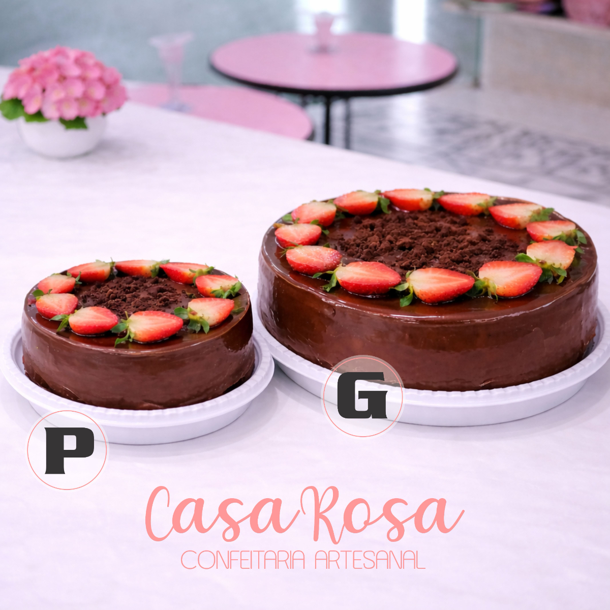 Massa fofinha feita com chocolate 50% cacau , coberta com brigadeiro belga e morangos frescos. (cobertura tbm no furo do bolo...muita cobertura) (Serve aproximadamente 5 pessoas) (Peso aproximado 750g).