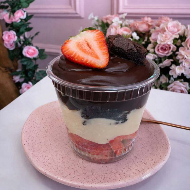 Creme de Ninho, brigadeiro cremoso, morangos frescos e pedacinhos de brownie.