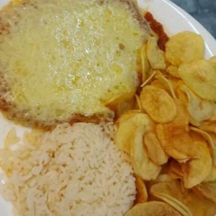 Aos 4 queijos: parmesão, muçarela, Catupiry e provolone. Acompanha arroz e fritas.