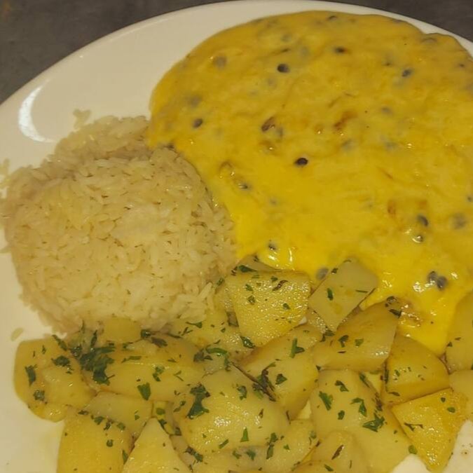 Filé de pescada empanado com molho de espinafre, gratinado com parmesão, arroz branco e fritas.