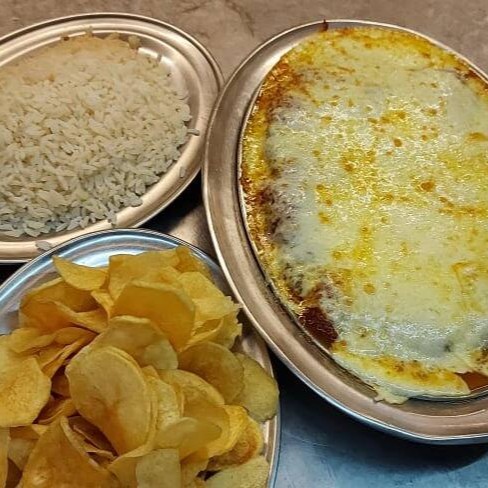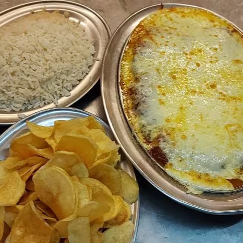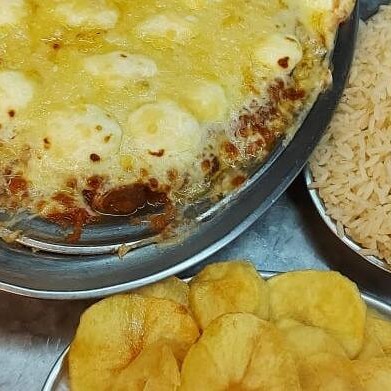 Aos 4 queijos: Parmesão, Muçarela, Catupiry e Provolone. Acompanha Arroz e Fritas.