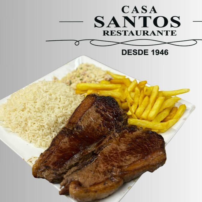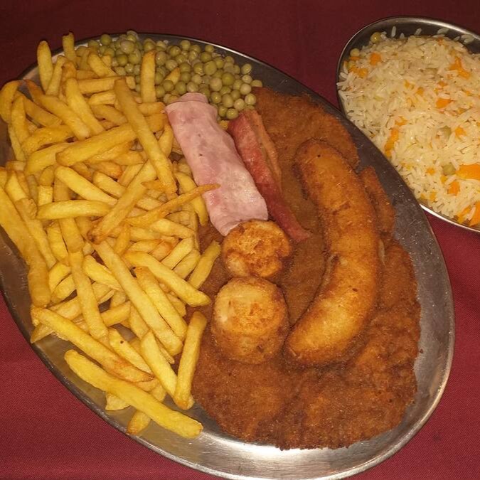Filé a milanesa com fritas, banana à milanesa, palmito à milanesa, bacon frito, ervilhas na manteiga, arroz à grega e fatia de presunto ou peito de perú.