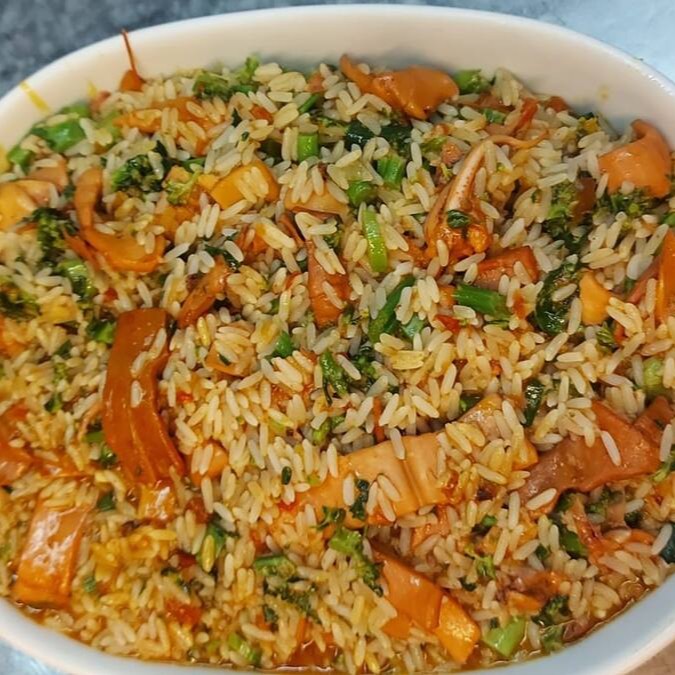 Delicioso refogado de arroz com lulas roxas com brócolis.