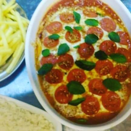 Nosso famoso filé à Parmegiana coberto por fatias de Pepperoni, alho frito e folhas de manjericão. Acompanha arroz e fritas.