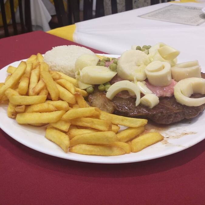 Filé assado na brasa com fatias de Presunto ou peito de Peru, Ervilhas e Palmito na manteiga, acompanha Ovo Frito, Batata e Arroz Branco.
