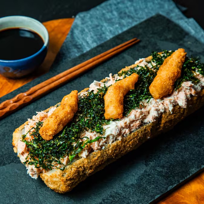 1/2 alga,arroz,salmão grelhado, empanado com farinha crocante.