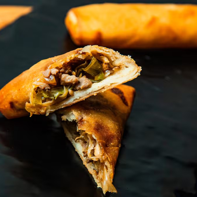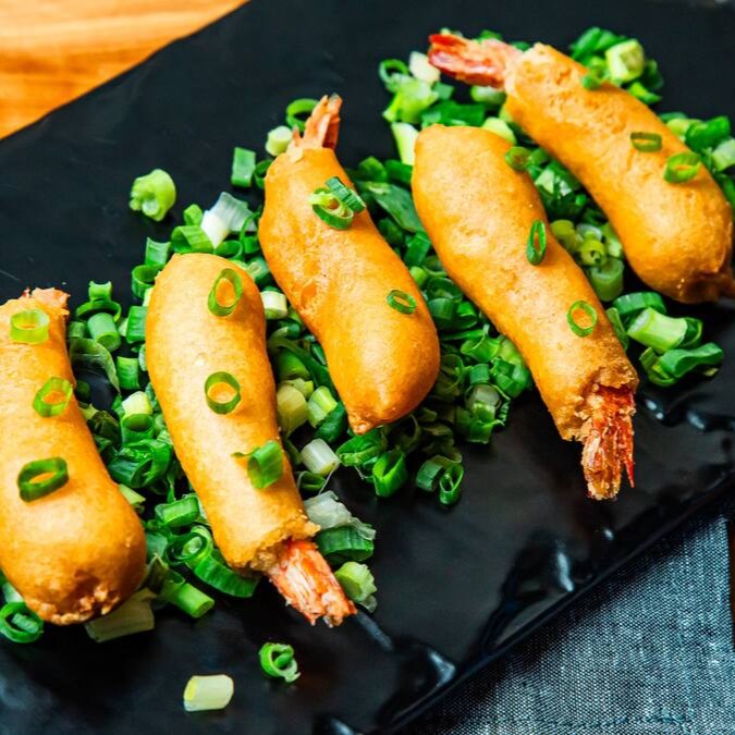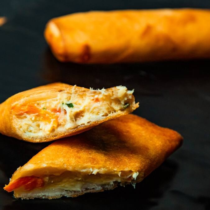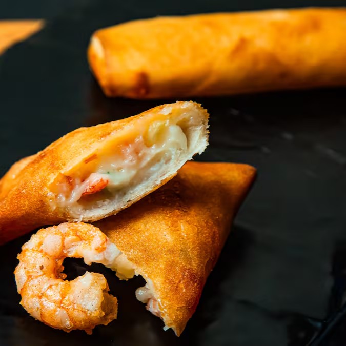 Massa crocante recheada com camarão, requeijão e cebolinha. Acompanha molho agridoce.