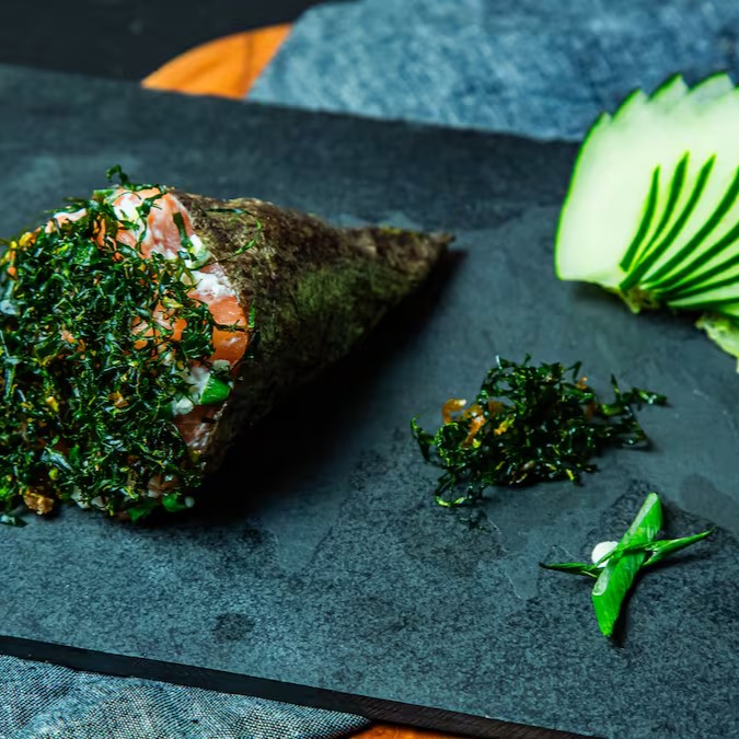 Temaki salmão cru com cream cheese e cebolinha coberto com couve crispy.