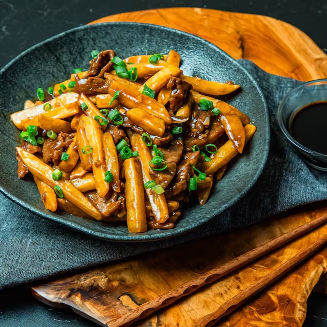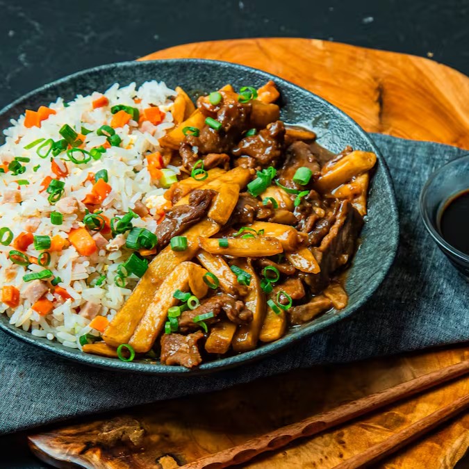 Combinação simples e saborosa de carne com batata e cebolinha mais um toque de gengibre ao molho especial Catay. Acompanha arroz yakimeshi.