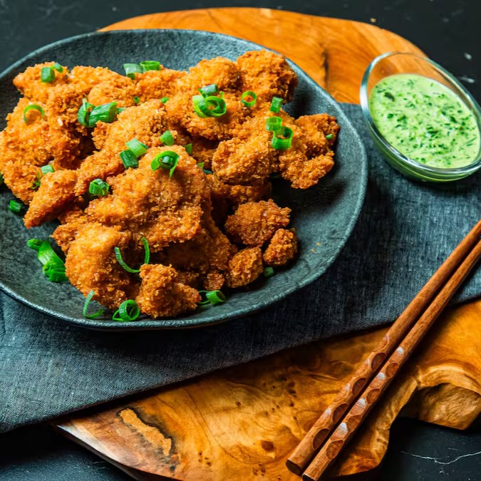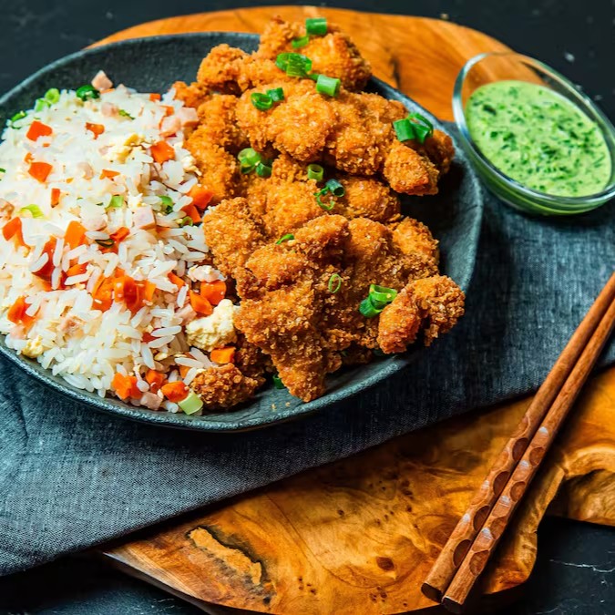 Filés de sobrecoxa, empanados com massa crocante. Acompanha Arroz Yakimeshi e molho verde a base de salsa e cebola.