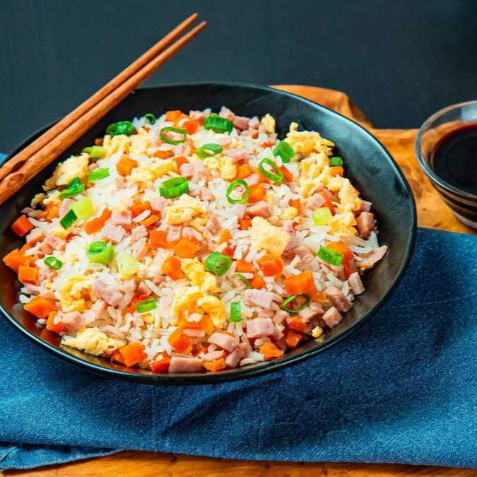 Arroz chinês com apresuntado, ovo, cenoura e cebolinha