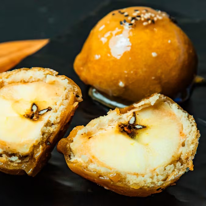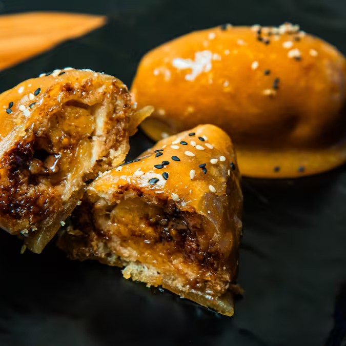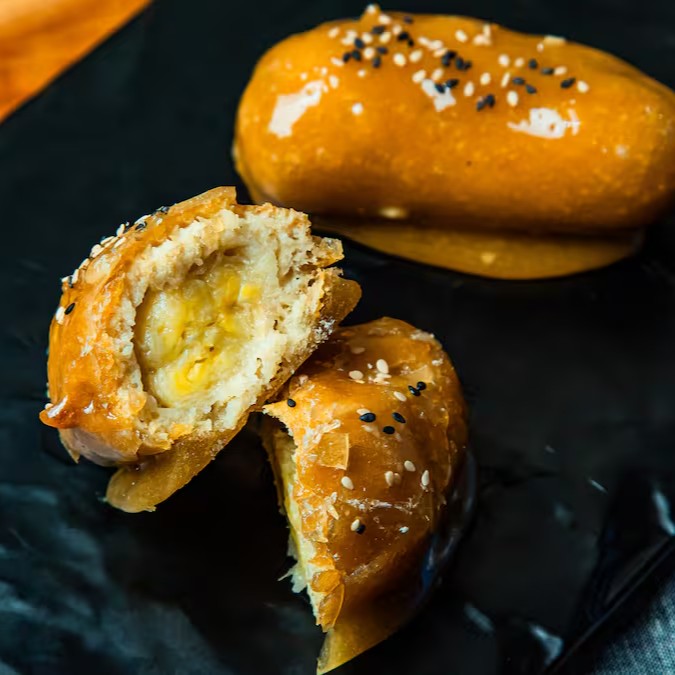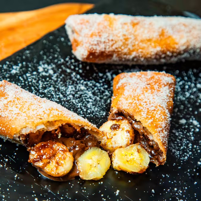 Massa crocante recheada com banana, canela e açúcar gourmet.