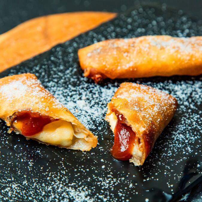 Recheado com banana, goiabada, cream cheese Polengui e enrolado com folha de Harumaki crocante. (8 Unidades). Coberto com leite condensado.