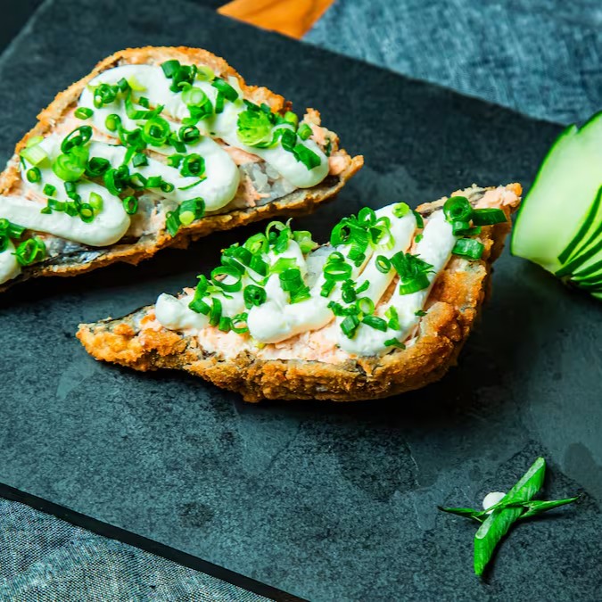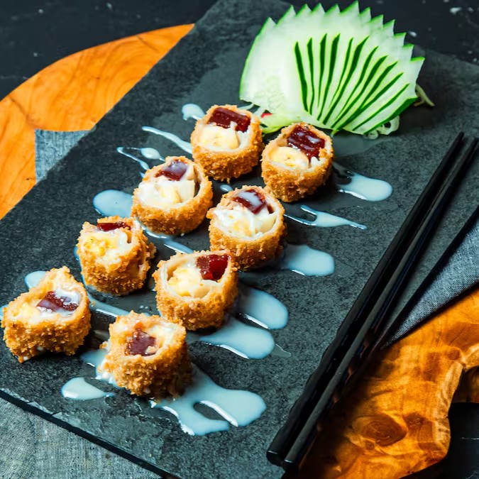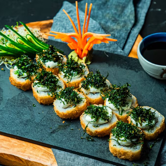 Alga por fora, arroz, recheado com cream cheese, salmão grelhado e empanados com massa crocante.
