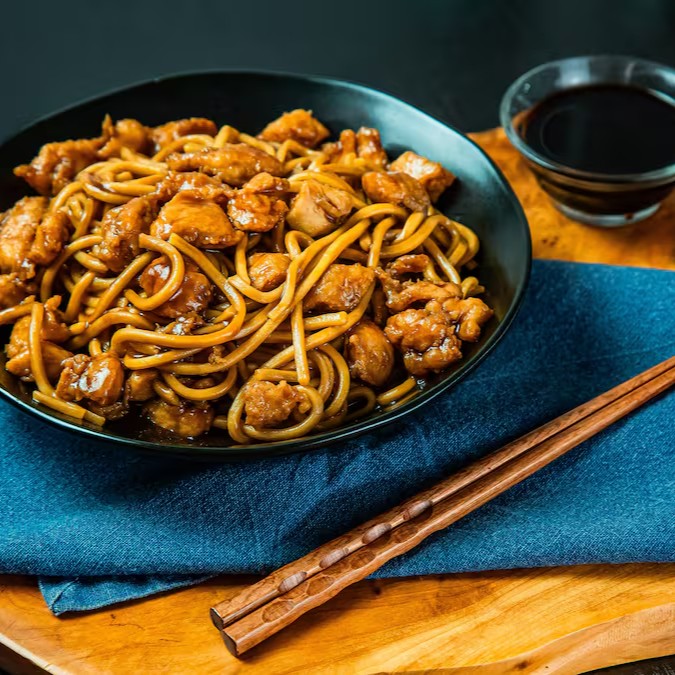 Filé de frango empanado com farinha crocante acompanhado do nosso delicioso macarrão chinês ao molho especial.