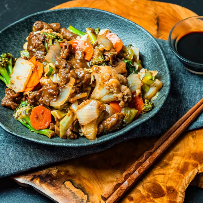 Saborosas fatias de carne com legumes e champignons acompanhados pelo molho especial Catay. Contém acelga, brócolis, couve flor, cenoura, cebola, pimentão e repolho. Temos opções que servem até 4 pessoas.