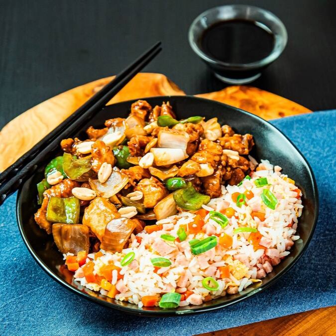 Generosos cubos de peito de frango, servidos com cebola, pimentão e amendoim. Ao molho especial Catay. Acompanha Arroz Yakimeshi.