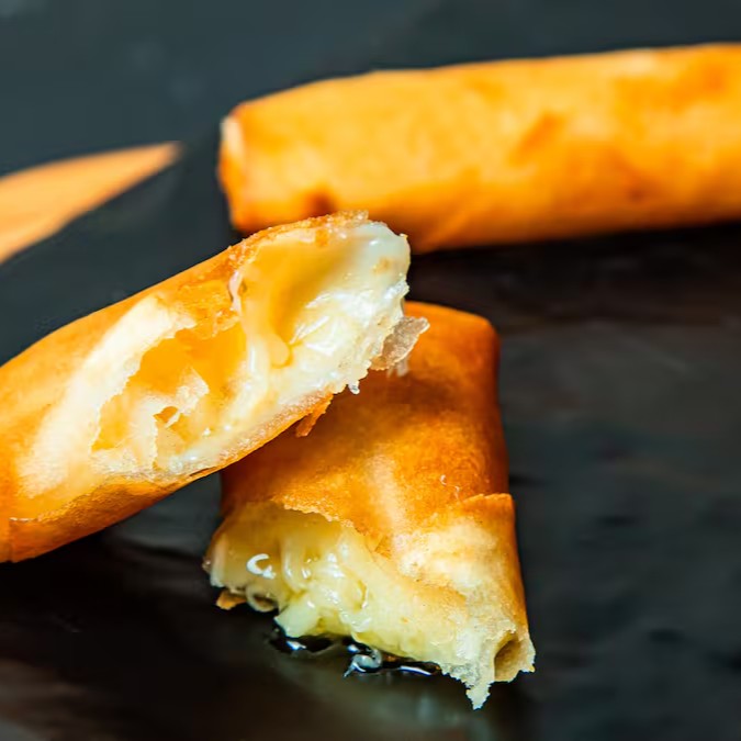 Tradicional massa crocante recheada com queijo mussarela. Acompanha molho agridoce.