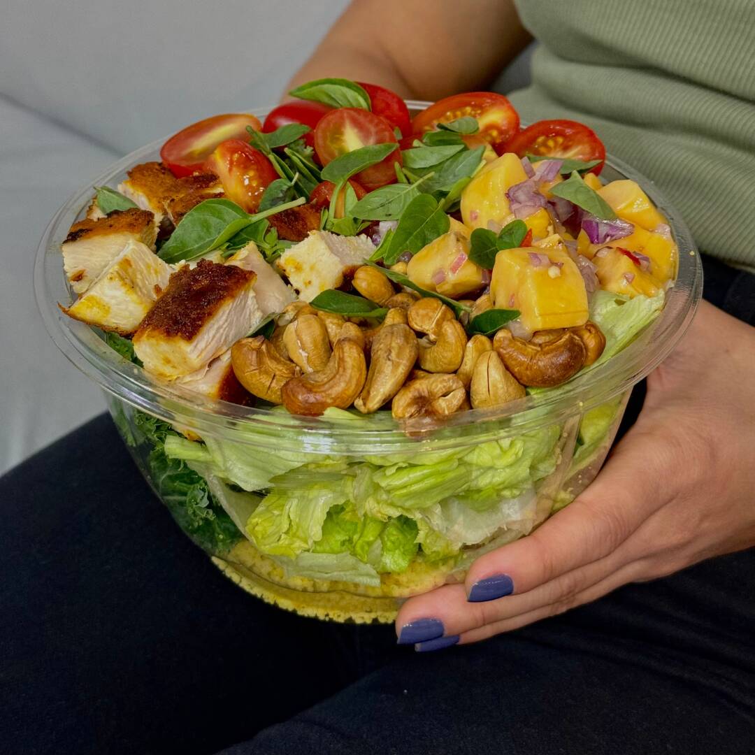 Mix de quinoa, alface americana, frango em cubos, legumes assados, brócolis, tomate cereja e castanhas. Acompanha molho e a nossa sugestão é o Pesto de manjericão!