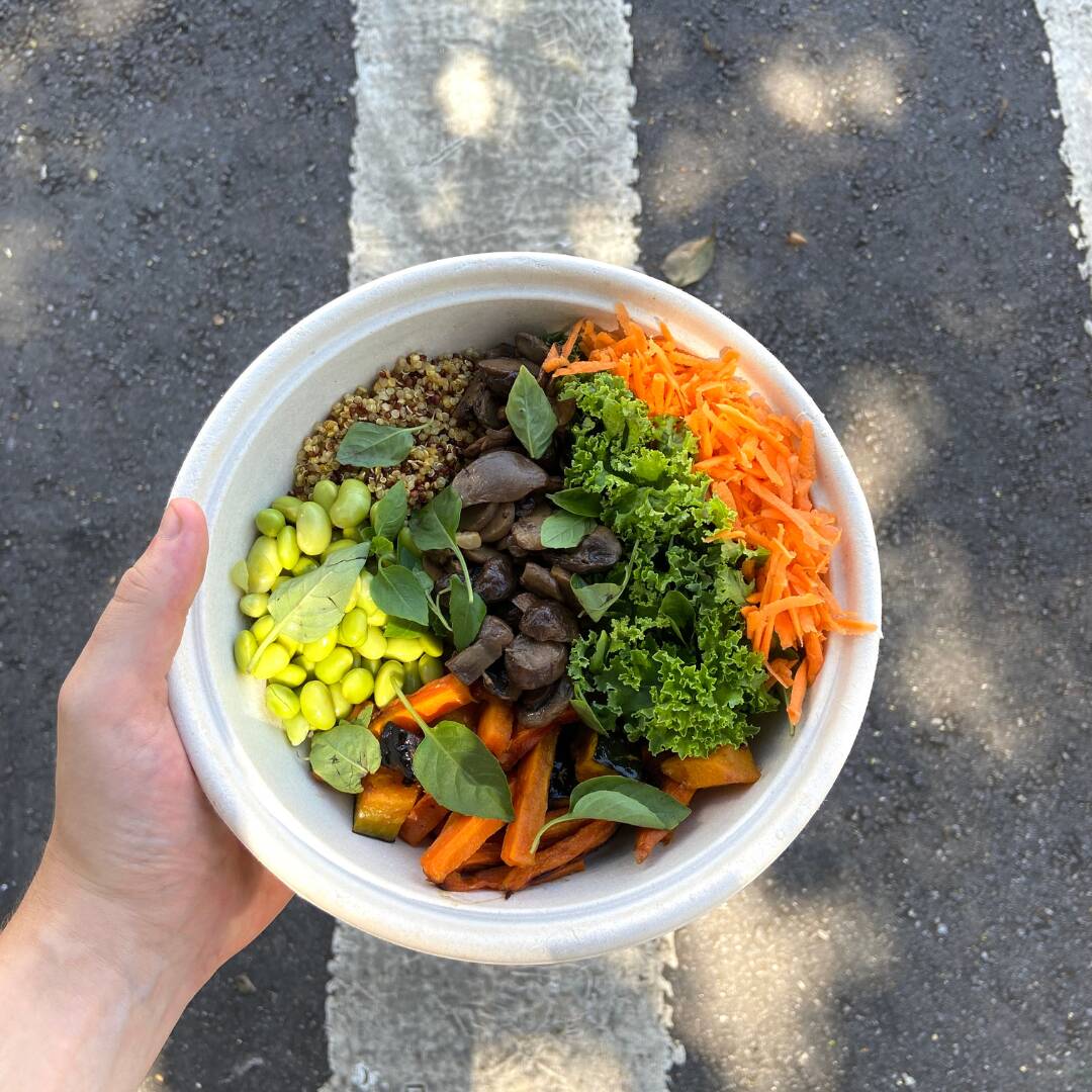 Cogumelos, mix de quinoa, edamame, legumes assados, cenoura ralada, kale e manjericão. Acompanha molho e a nossa sugestão é o Fresh Tahine :)