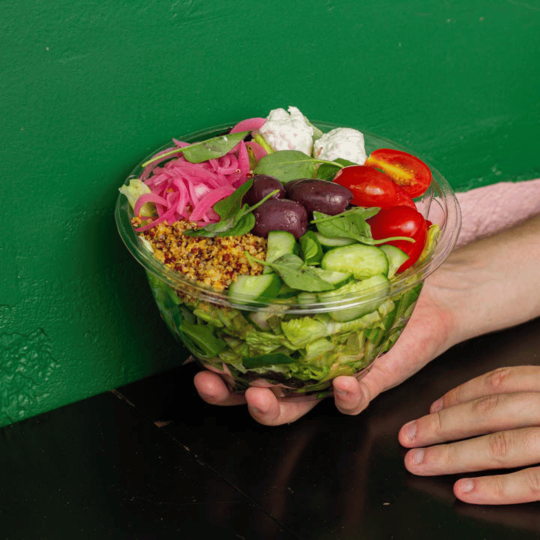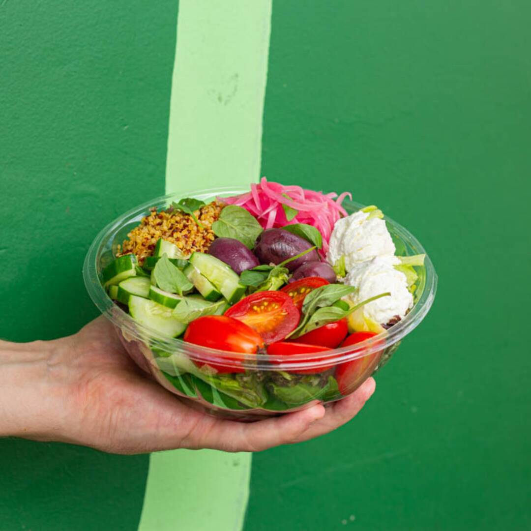 Mix de folhas, mix de quinoa, queijo de cabra, tomate cereja, pepino, picles de cebola roxa, azeitonas pretas e manjericão. Acompanha molho, sugestão: Ervas frescas.
