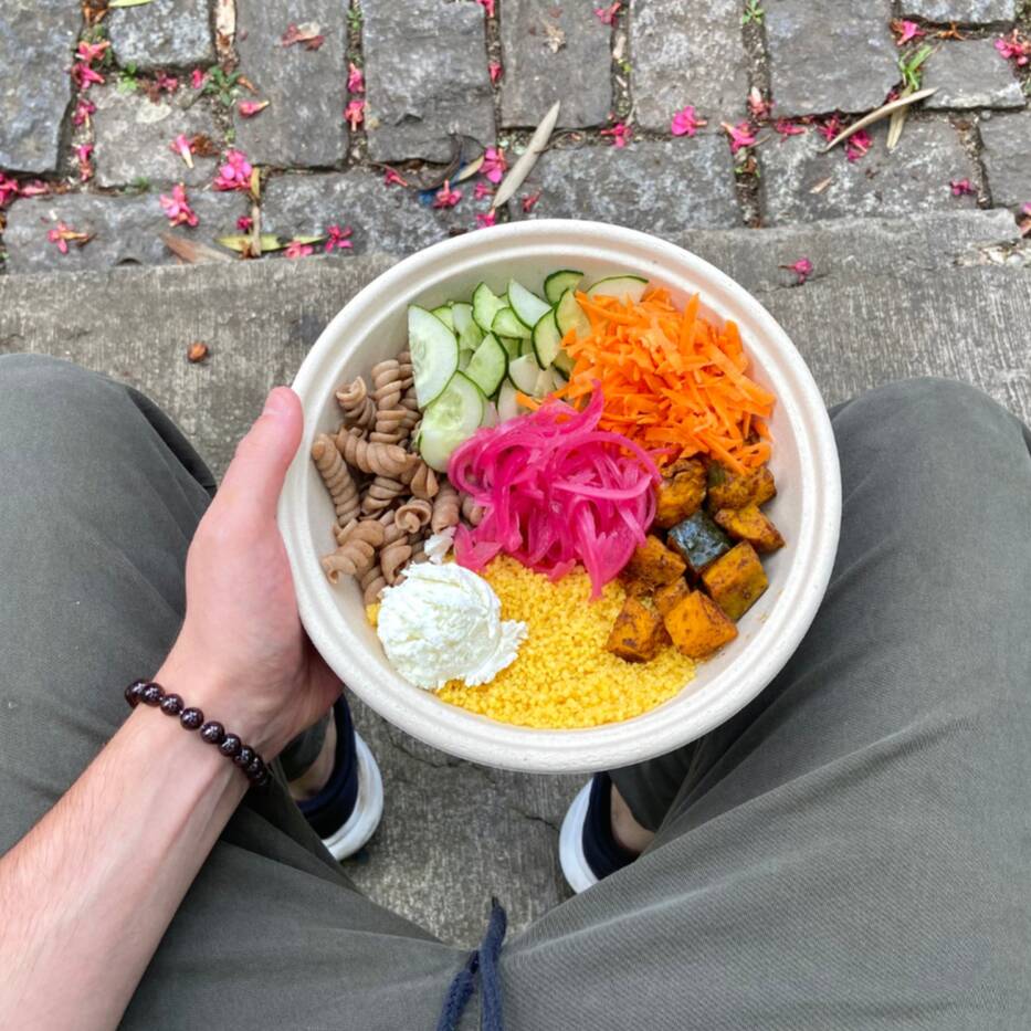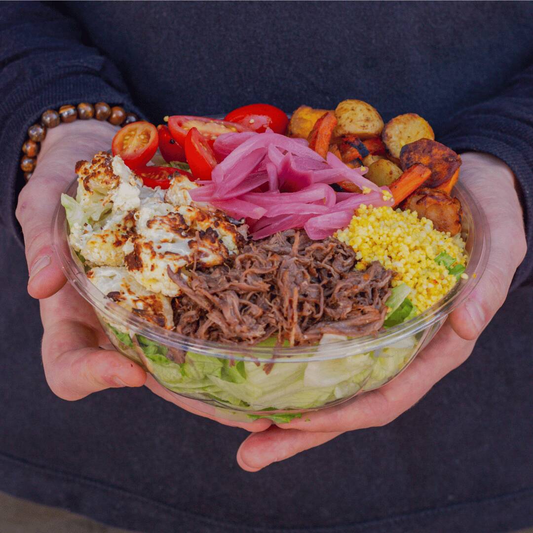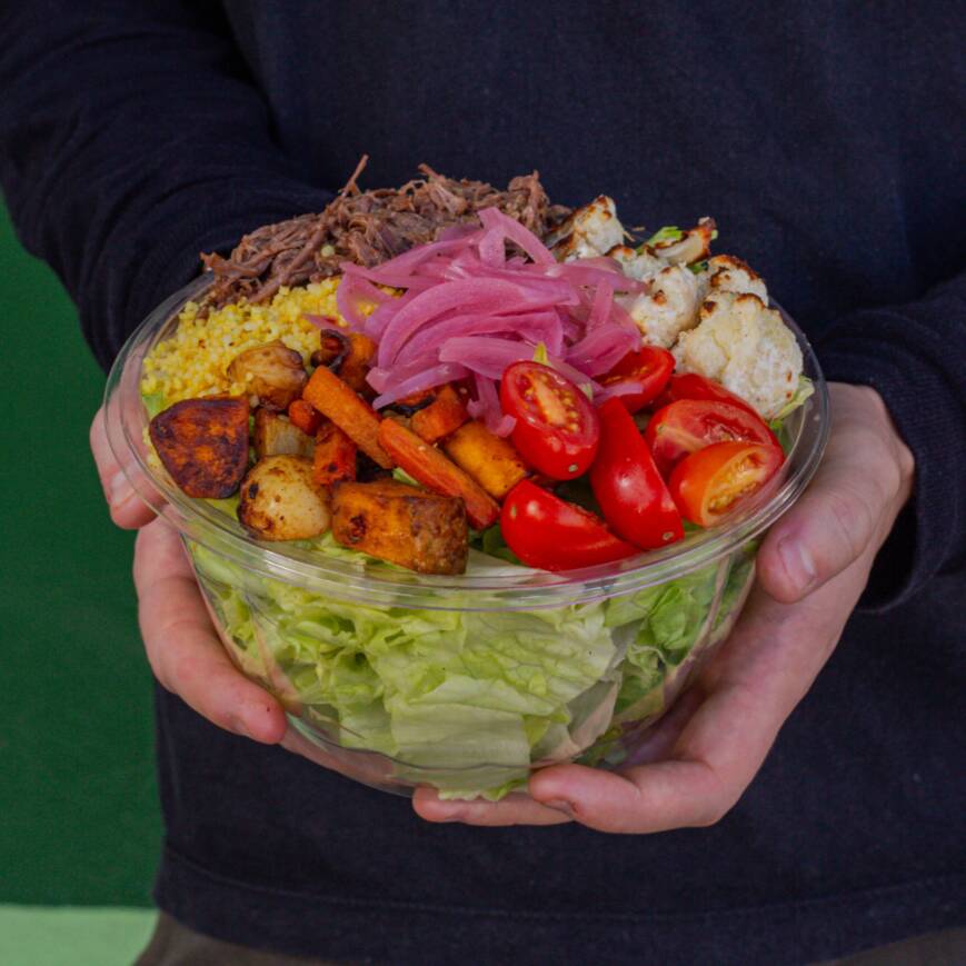 Alface americana, couscous marroquino, carne desfiada, tomate cereja, couve-flor assada, legumes assados e picles de cebola roxa. Acompanha molho e a nossa sugestão é o de mostarda e melado :)