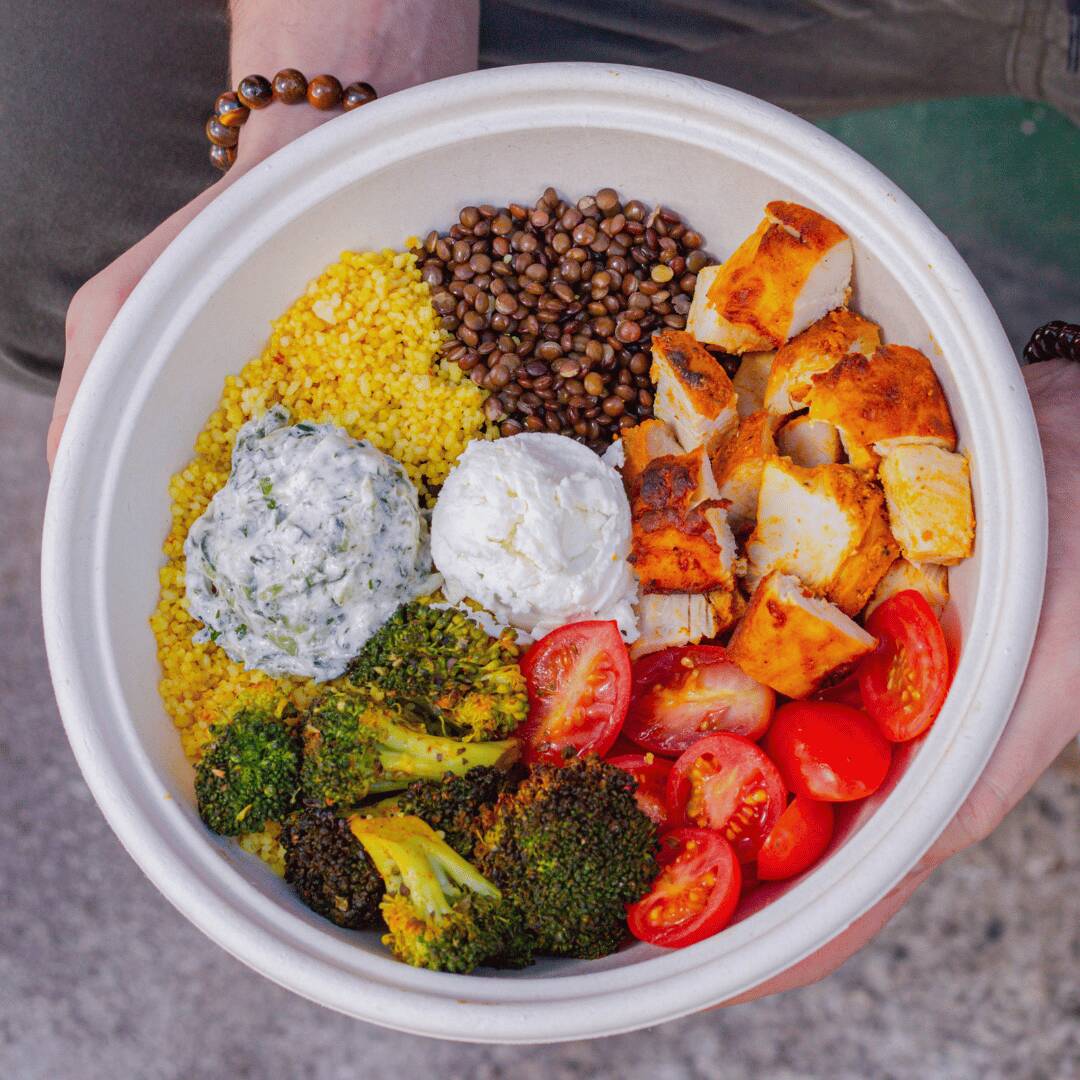 Couscous marroquino, lentilha preta, frango em cubos, queijo de cabra, tzatziki (pasta de pepino com iogurte), tomate cereja e brócolis. Pra dar um match perfeito a nossa sugestão de molho é o de Iogurte com limão :)