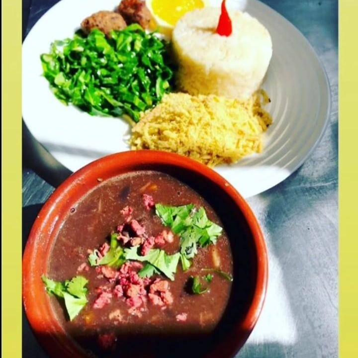 Feijoada (cebola, alho, louro, batata doce, cenoura, seitan, bacon bits, sriracha, abobora, berinjela defumada), arroz com milho, farofa,couve refogado.