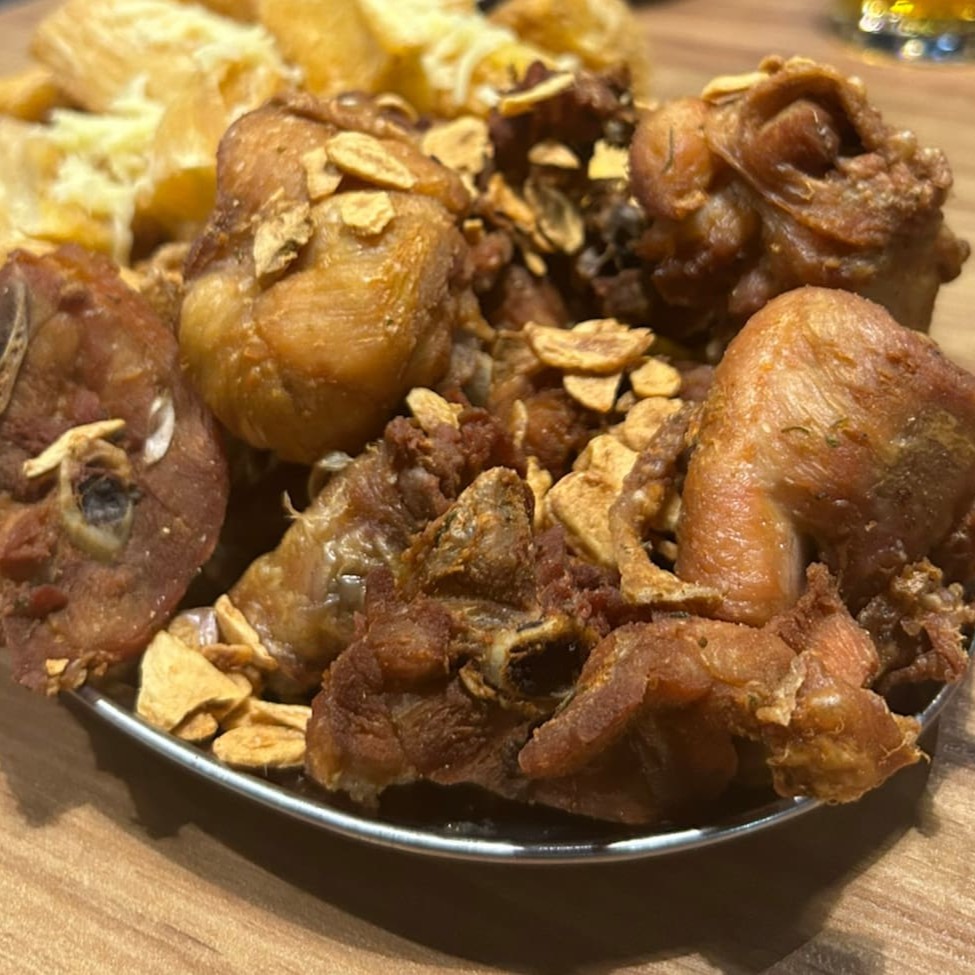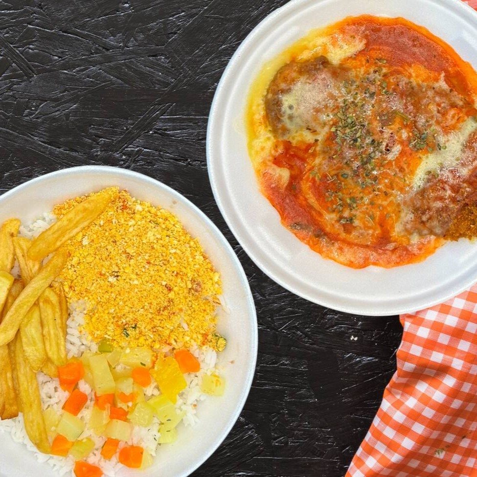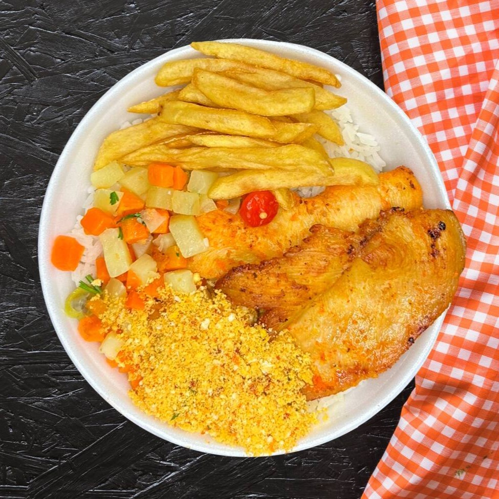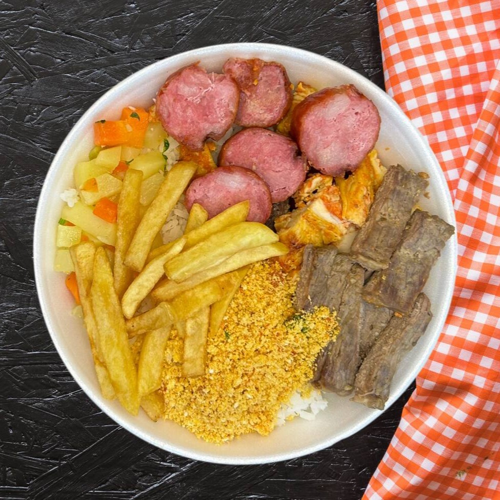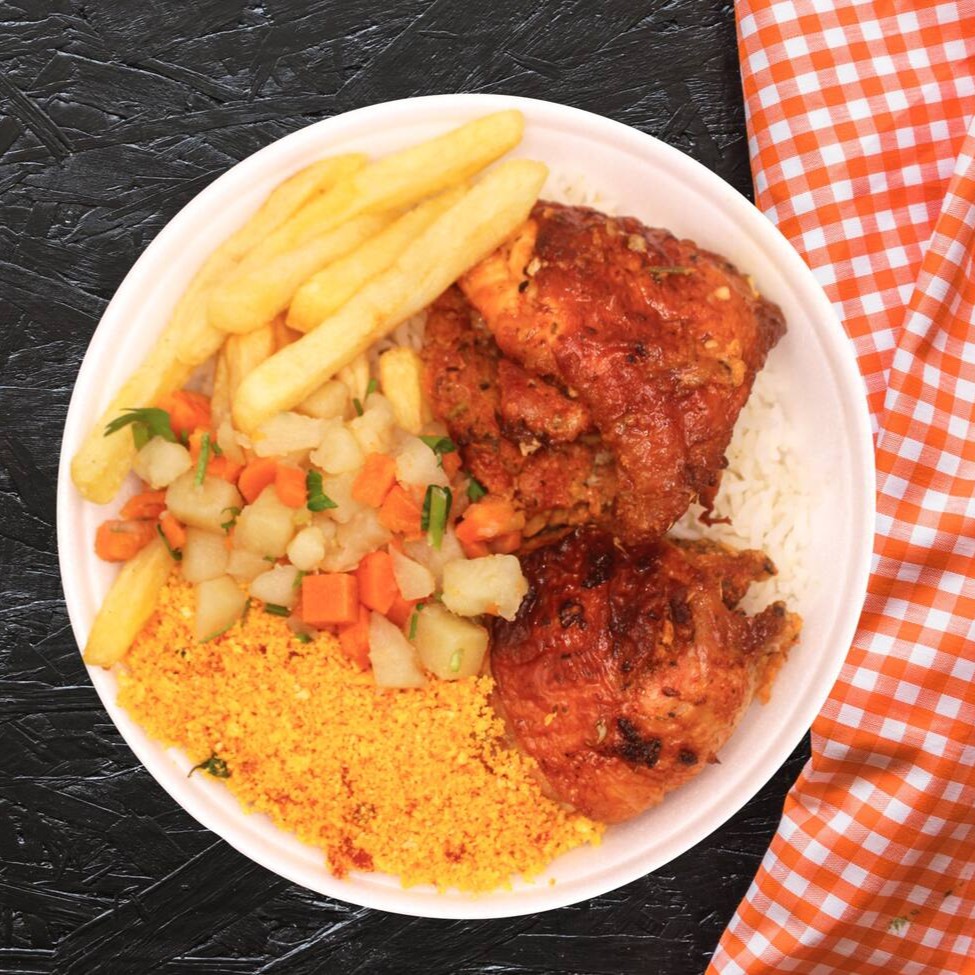 Arroz, Feijão, Batata Frita, Farofa, Frango Assado e Salada