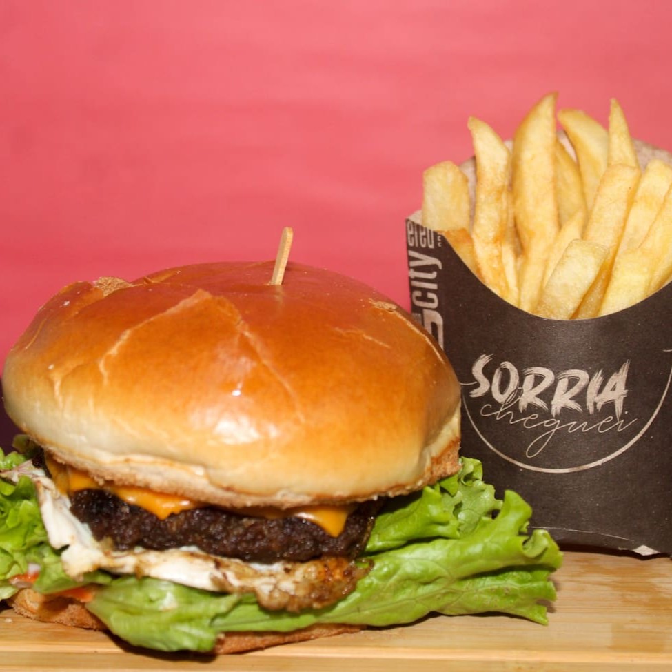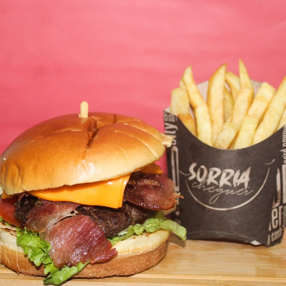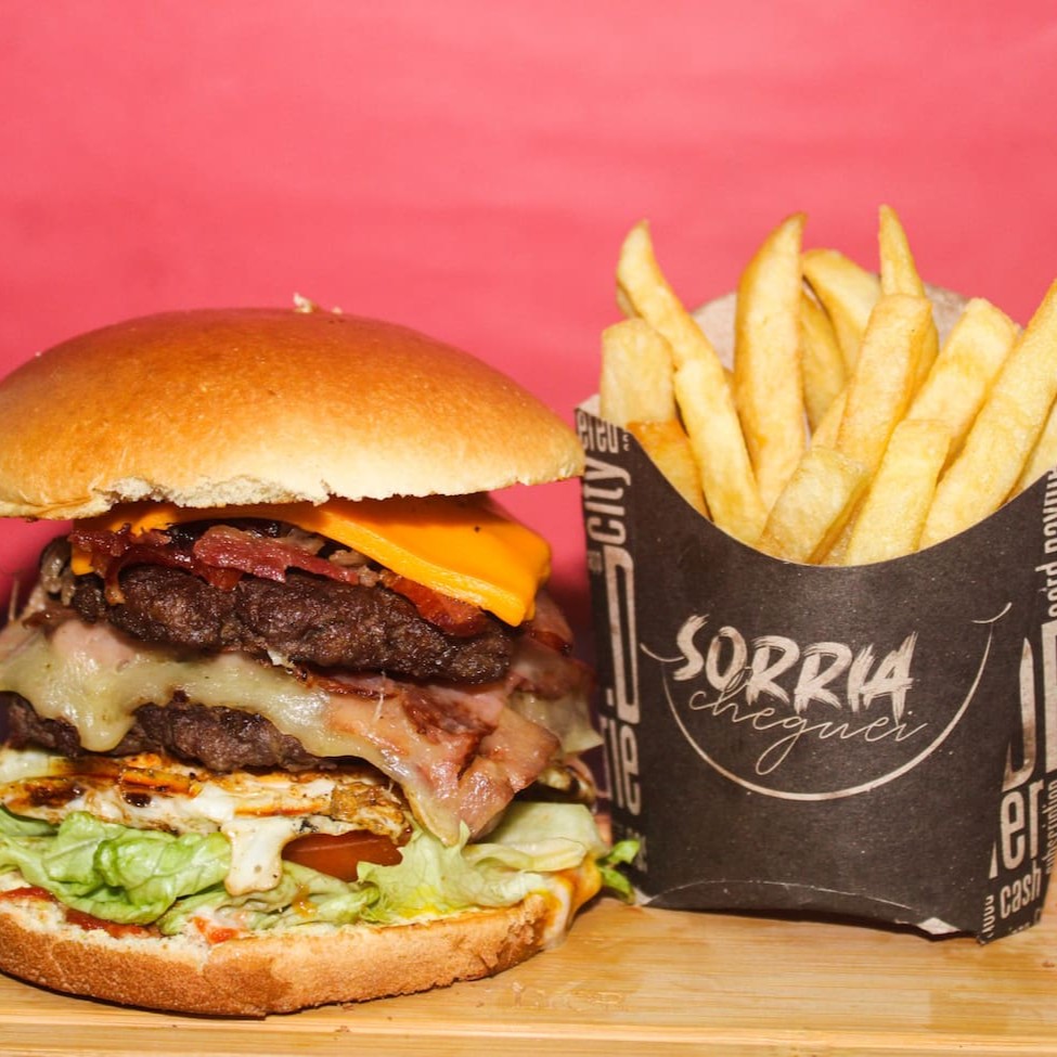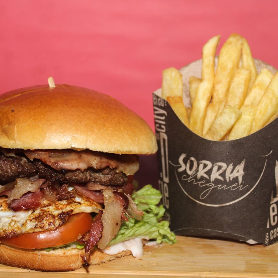 Pão, hambúrguer, presunto, mussarela, ovos, bacon, alface, tomate, maionese, ketchup, mostarda