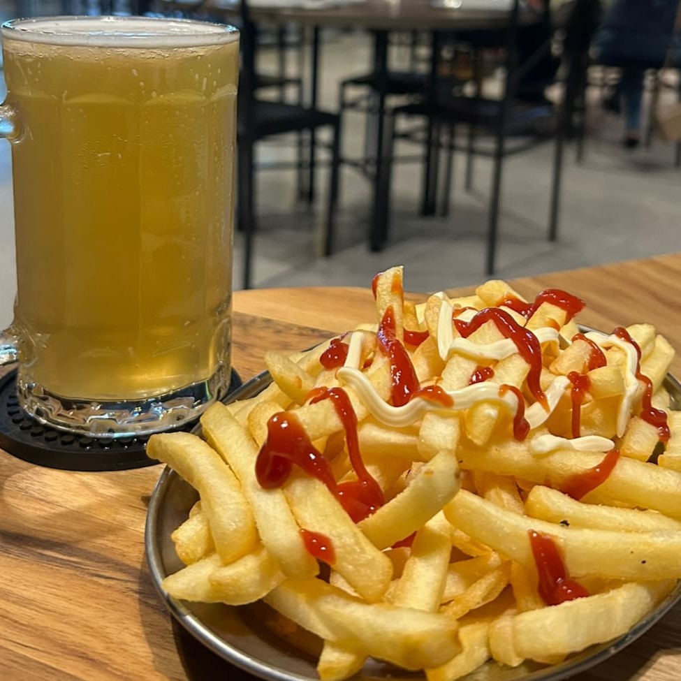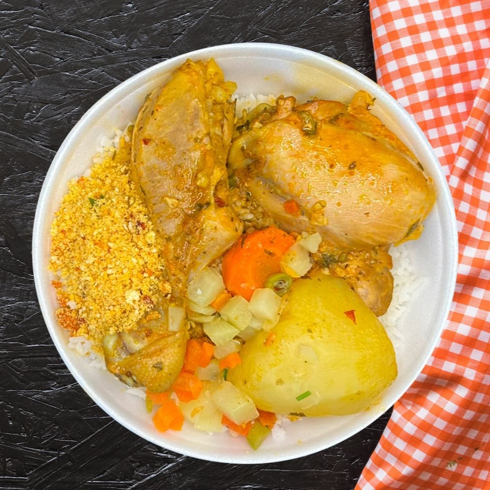 Arroz, Feijão, Batata Frita, Farofa, Frango Ao Molho E Salada