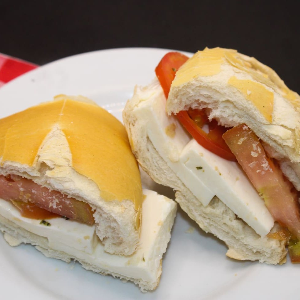 Pão Francês, queijo branco fresco, tomate e orégano.