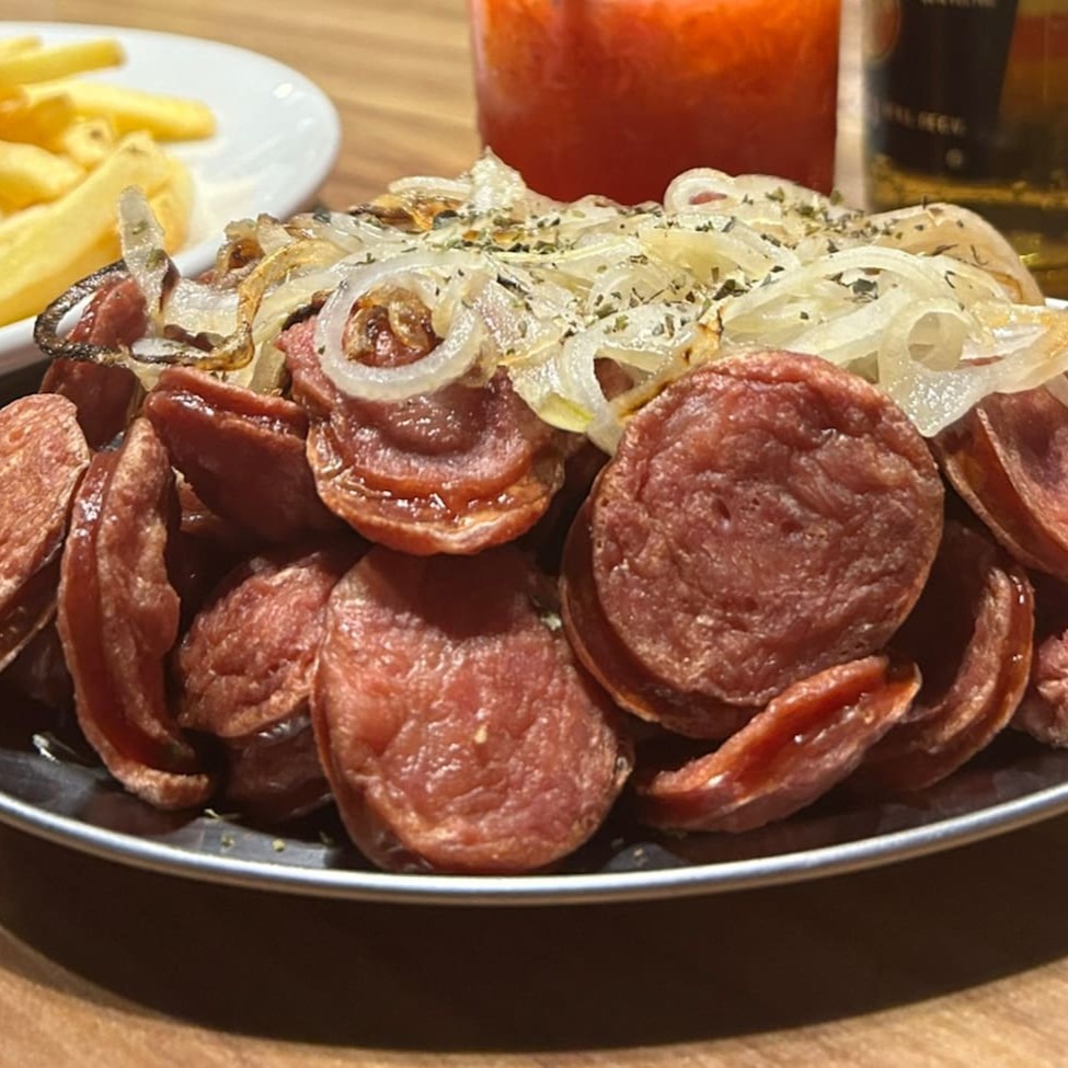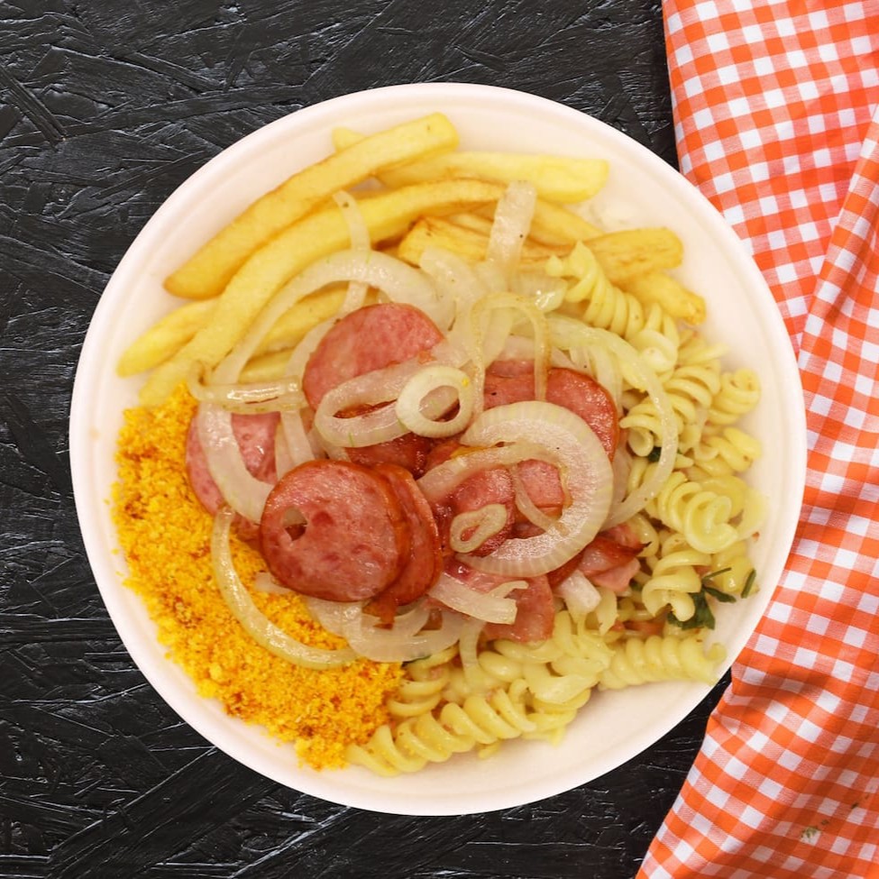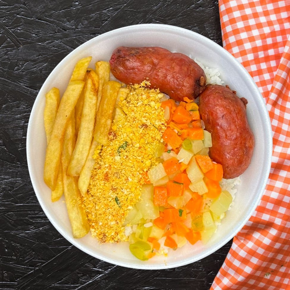 Arroz, feijão, batata frita, linguiça toscana, farofa e salada