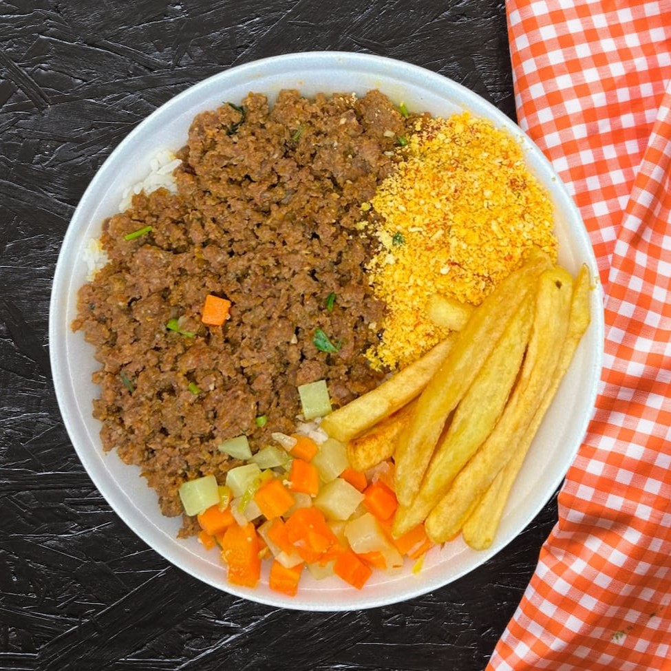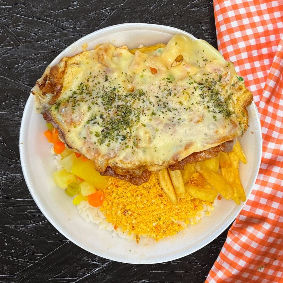 Arroz, Feijão, Batata frita, Bife, Ovo frito, farofa e Salada