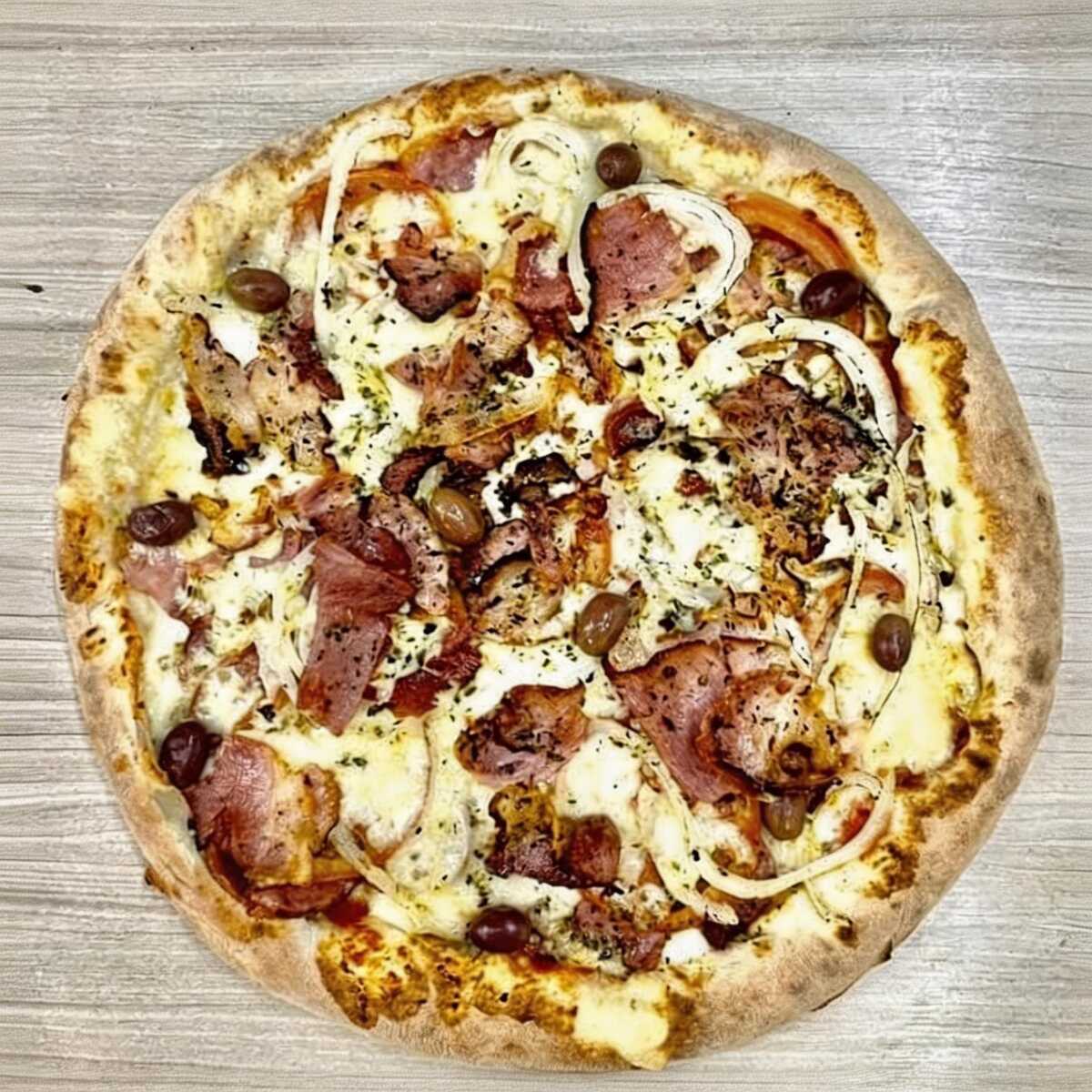Lombo, calabresa fatiada, cebola, mussarela e bacon