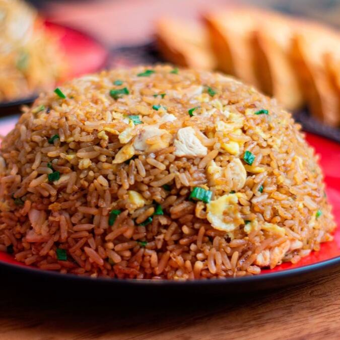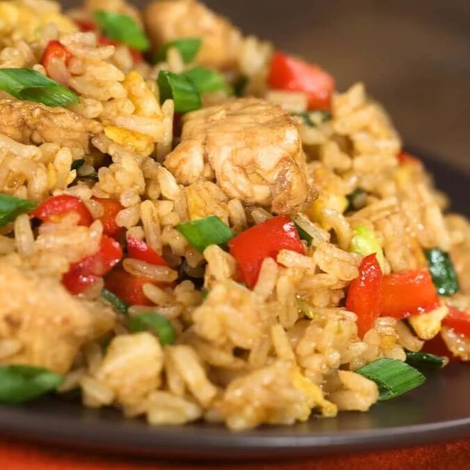 Arroz, pedaços de frango, ovo mexido, cebola chinesa e shoyu