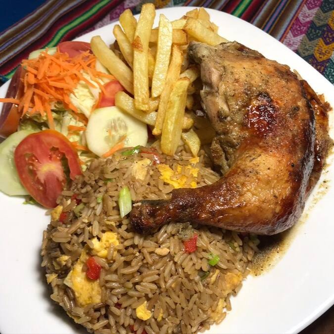 Arroz chaufa, 1/4 pollo a la brasa, batata frita e salada