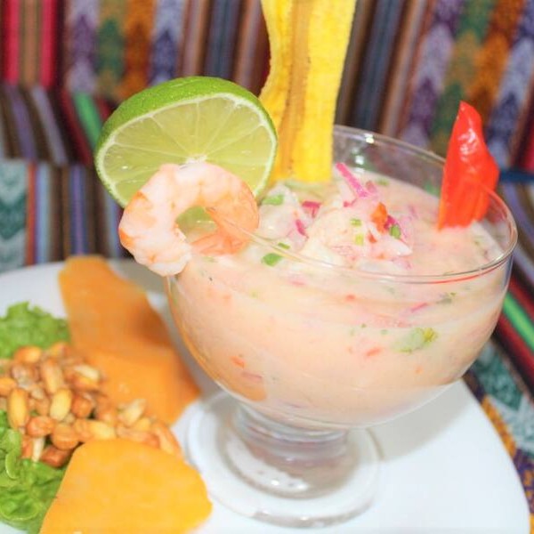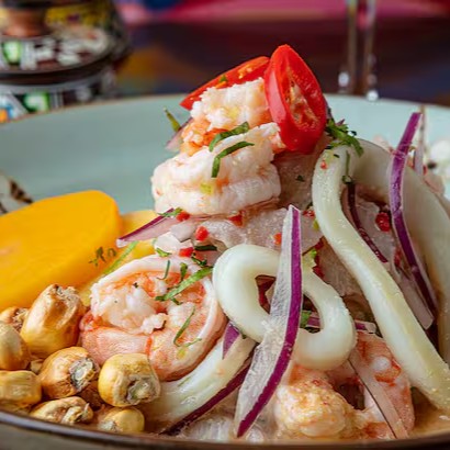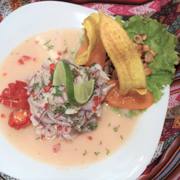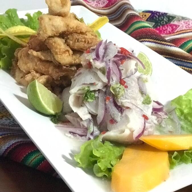 Peixe, camarão, polvo, mexilhão, lula, marinado em suco de limão. Acompanhado com batata, batata doce e milho peruano torrado