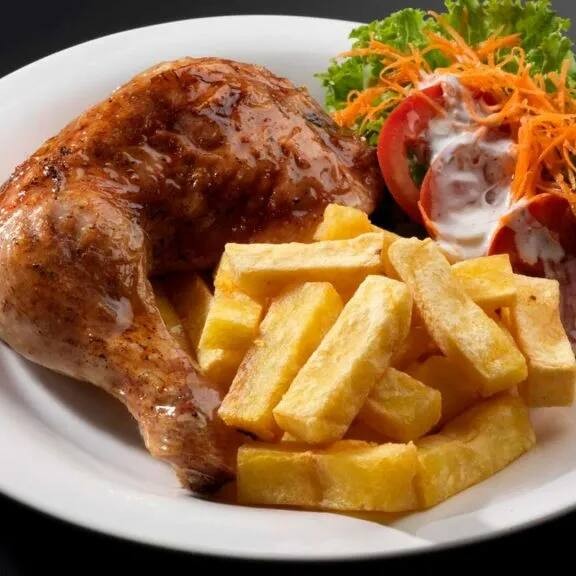 Um delicioso frango, com as suas batatas fritas e porção de salada