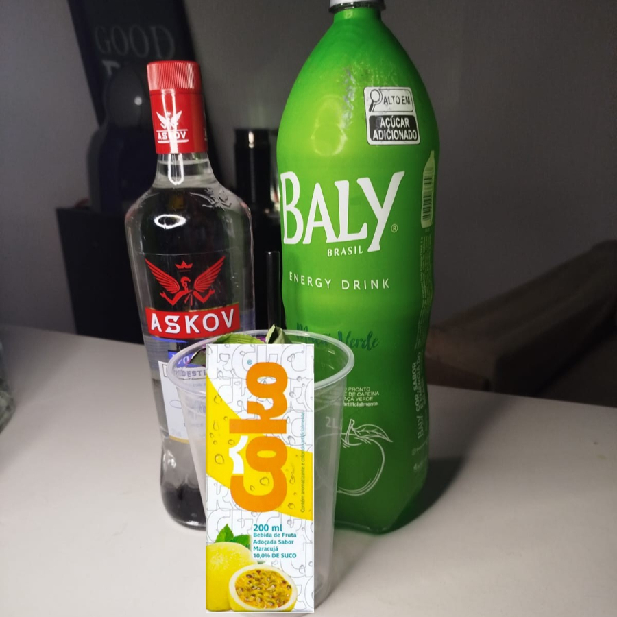 Askov (DOSE!!!) com gelo de maracujá e energético de maçã verde EM UM COPO DE 700ML. >>Não é possível alterar nenhum insumo do item, não insista<<