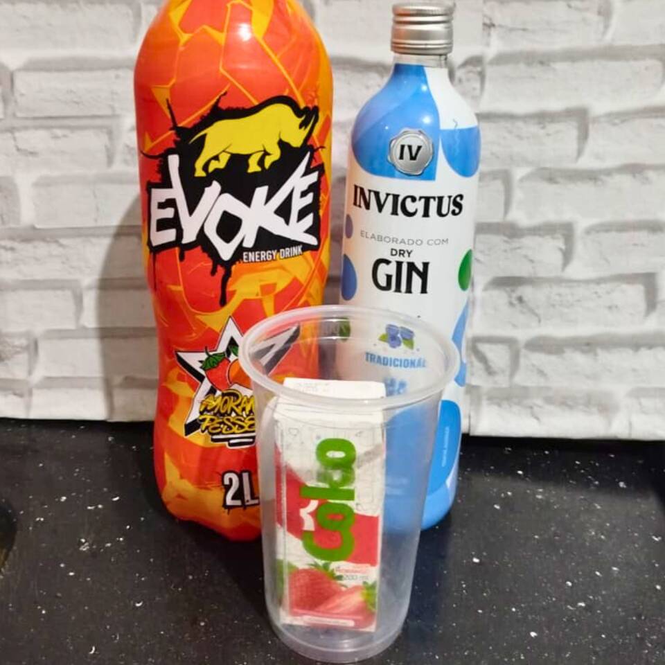 Gin (DOSE!!!!) Invictus (100ml) com energético Evoke de Morango e Pêssego (200ml) e gelo saborizado de morango (200ml) em UM COPO DE 500ML. Bebida de linha econômica, bastante conhecida pelo custo-benefício. Ideal para quem quer algo simples para curtir. Para paladares mais exigentes, recomendamos nossas opções premium. >>Não é possível alterar nenhum insumo do item, não insista<<