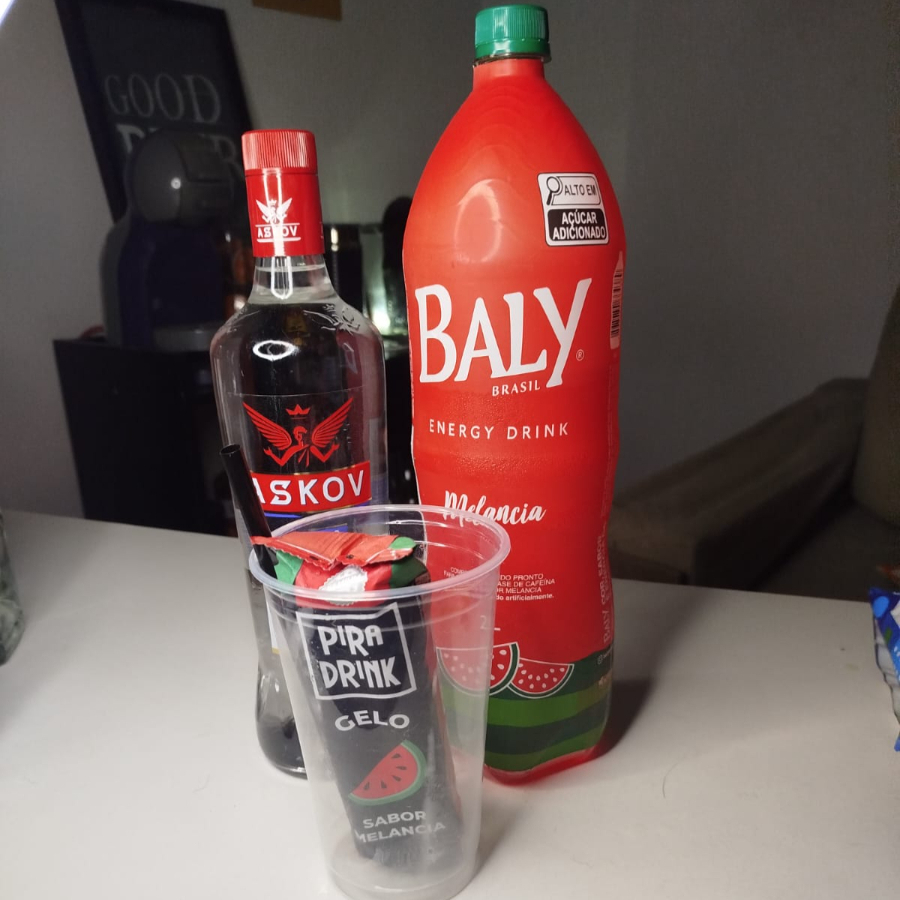 Askov (DOSE!!!) com gelo e energético de melancia EM UM COPO DE 700ML. >>Não é possível alterar nenhum insumo do item, não insista<<