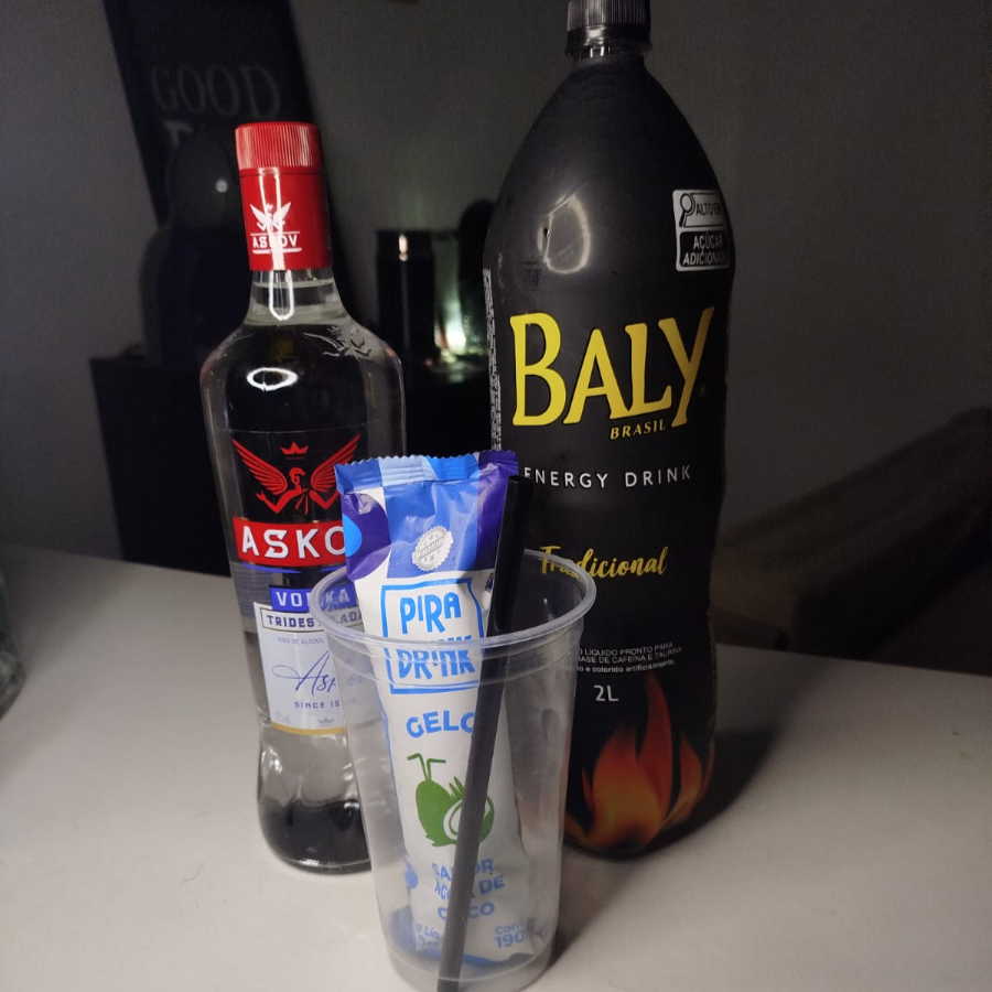 Askov (DOSE!!!) com gelo de coco e energético tradicional EM UM COPO DE 700ML. >>Não é possível alterar nenhum insumo do item, não insista<<