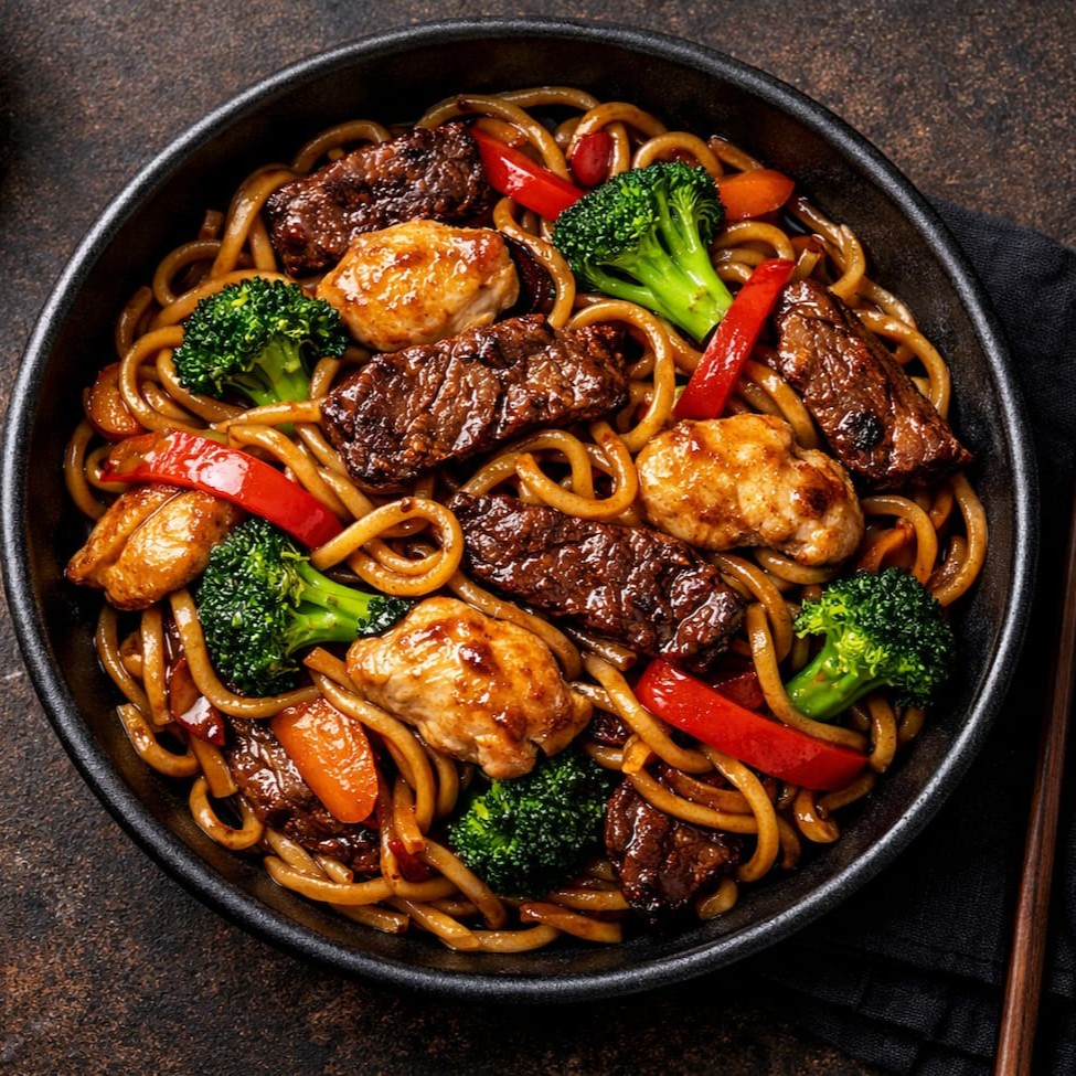 O clássico dos clássicos! Macarrão selado na wok com tiras de carne bovina macia e peito de frango macio e suculento, acompanhado de um mix de legumes frescos (acelga, brócolis, cenoura) e nosso exclusivo molho yakisoba que o chefe trouxe da china ultra consistente e saboroso. Obs: Servido em box de 850ml (aprox. 650 gramas).