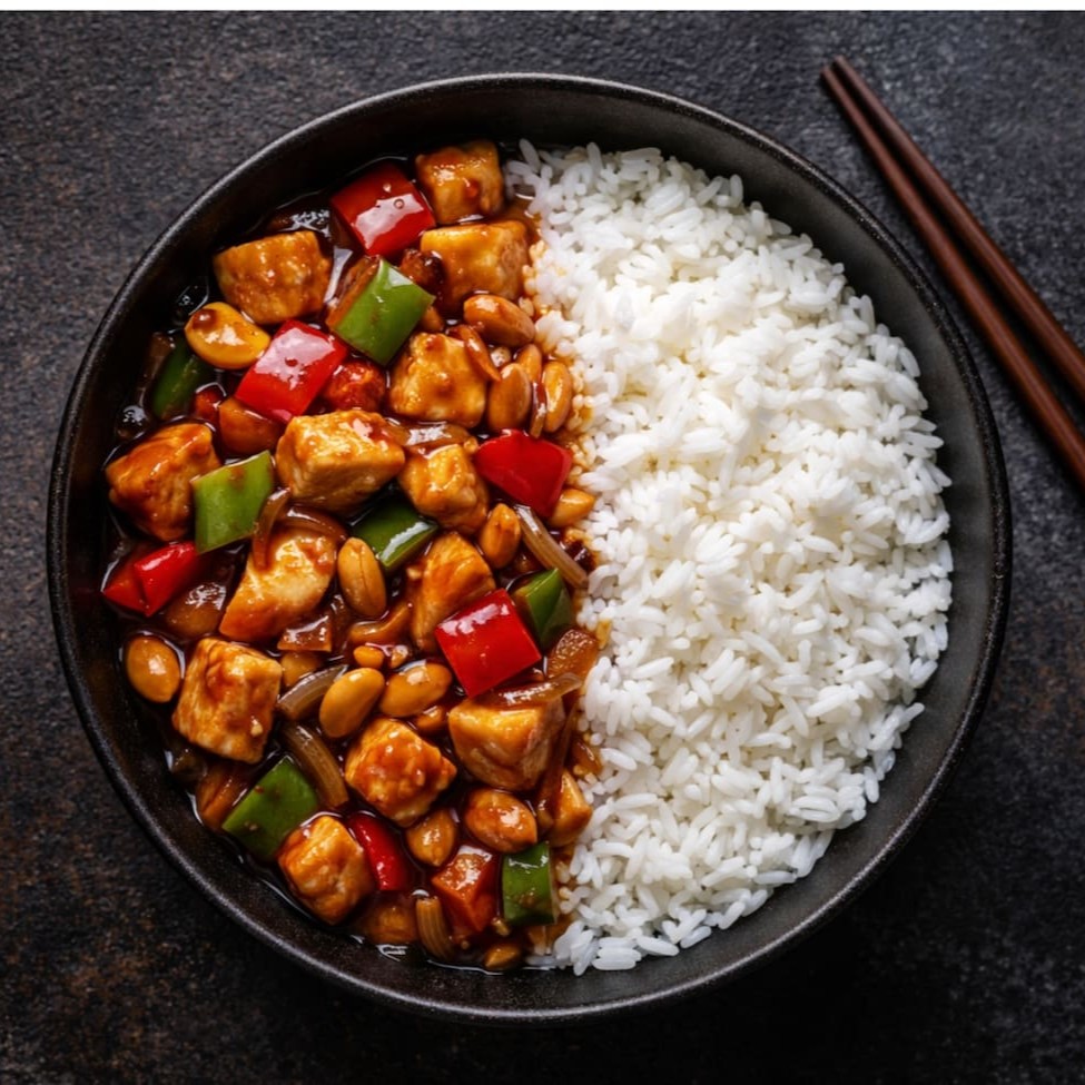 Cubos de peito de frango suculentos, salteados na wok com pimentões coloridos, cebola e amendoins crocantes, envoltos em um molho oriental encorpado e brilhante. Acompanha nosso clássico arroz asiático (Gohan). Servido em box de 850ml (aprox. 650g).