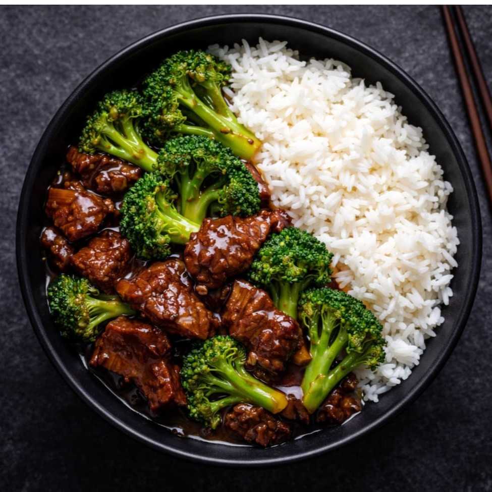 Fatias macias de carne bovina selecionada, preparadas com brócolis frescos e crocantes ao molho de soja especial da casa, com um toque de vinho chinês. Acompanha arroz asiático branco e soltinho. Obs: Servido em 2 box de 850ml (aprox. 650g cada).